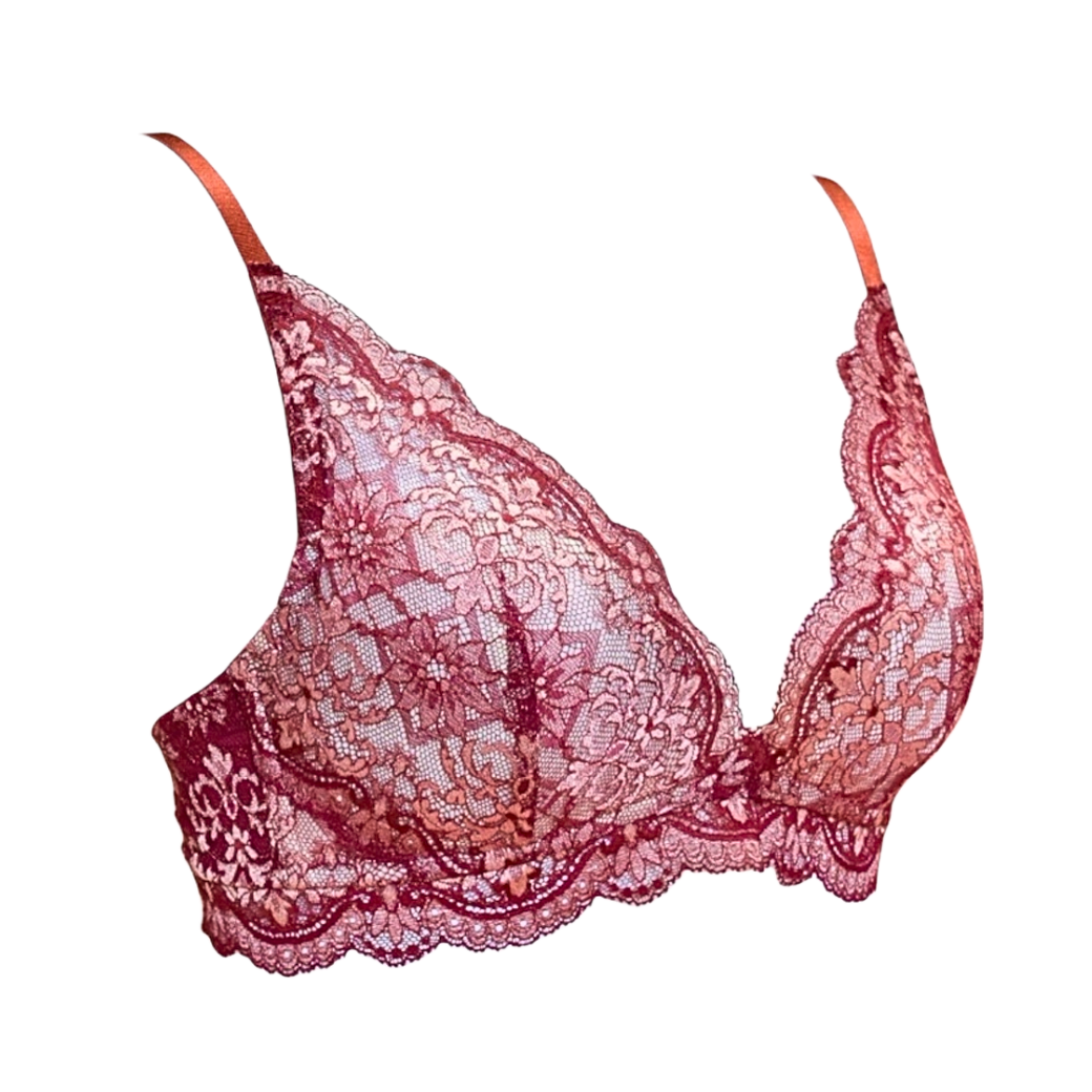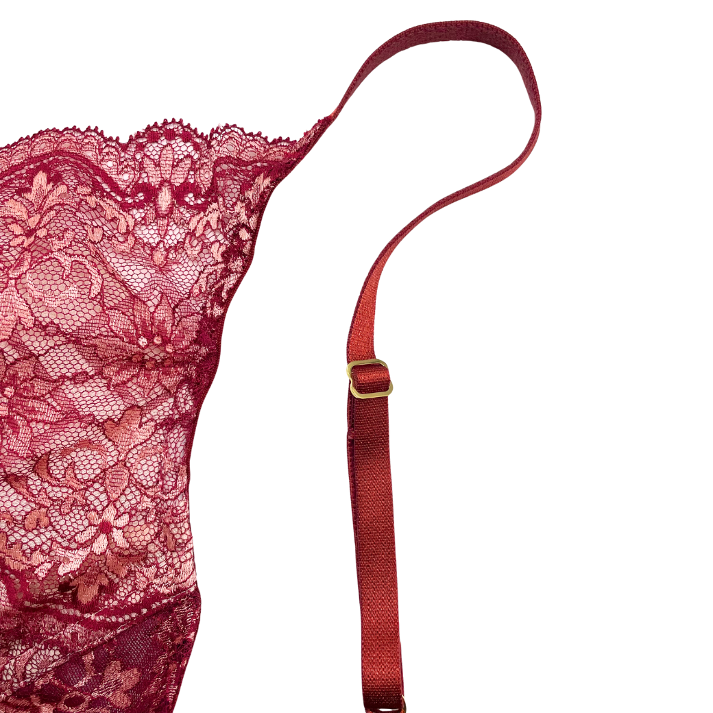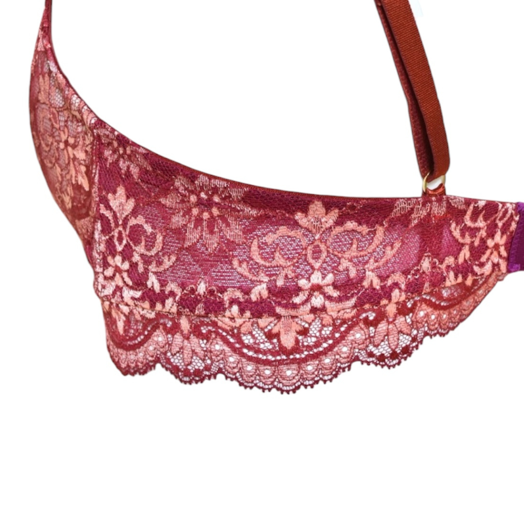 レース、土台の色はワインレッドピンク。肩紐は深い臙脂(えんじ)色です。
