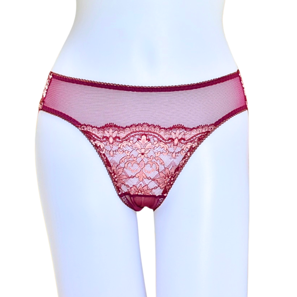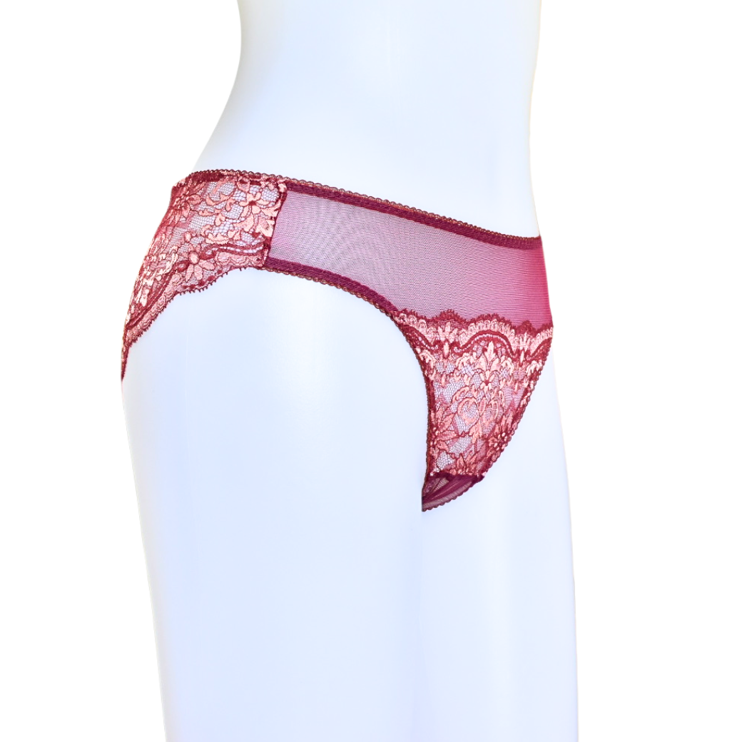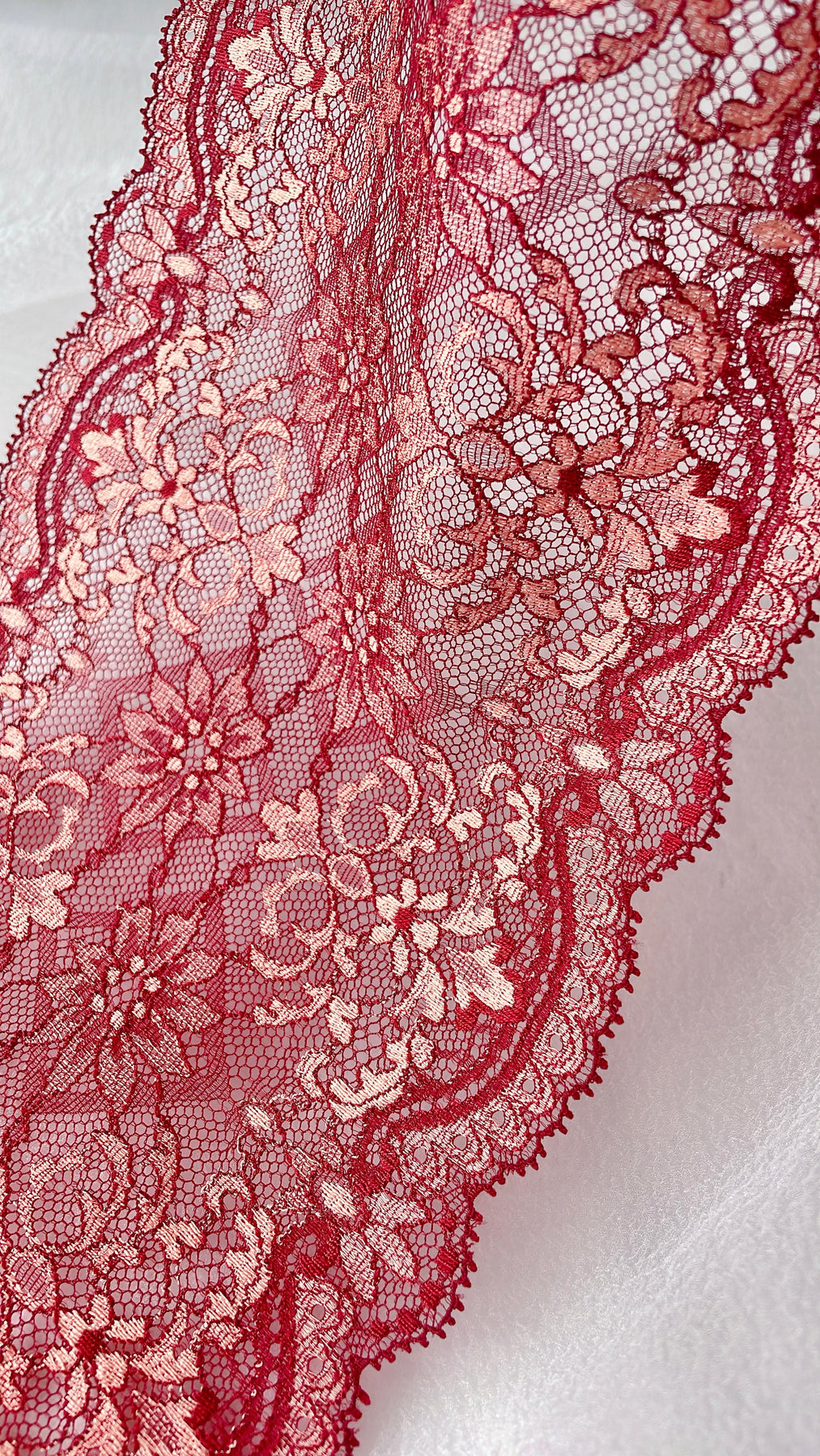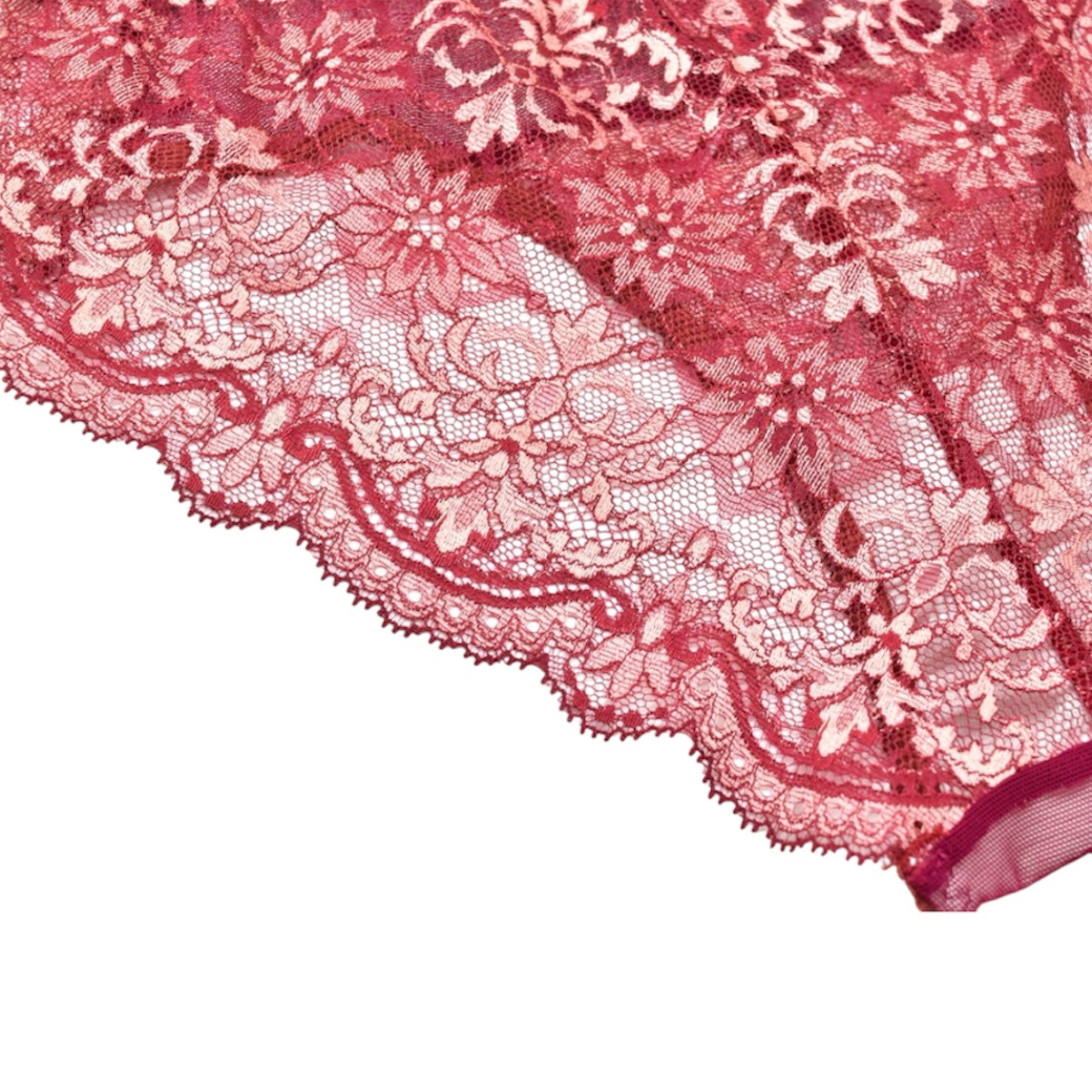 レース、土台の色はワインレッドピンク。ストラップと内側のゴムは深い臙脂(えんじ)色です。