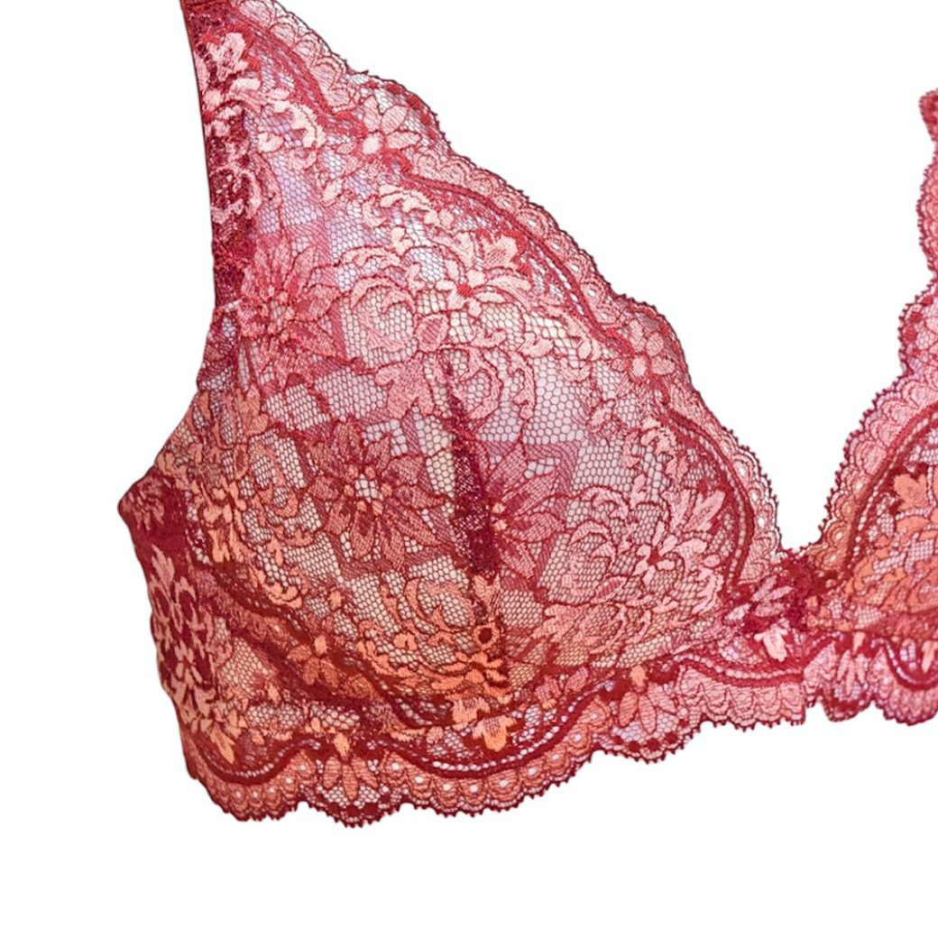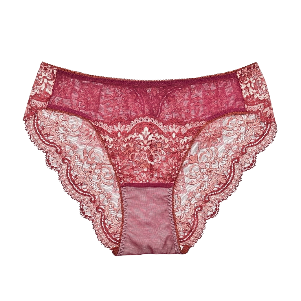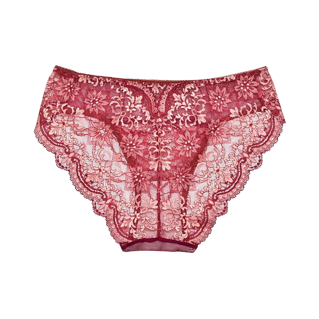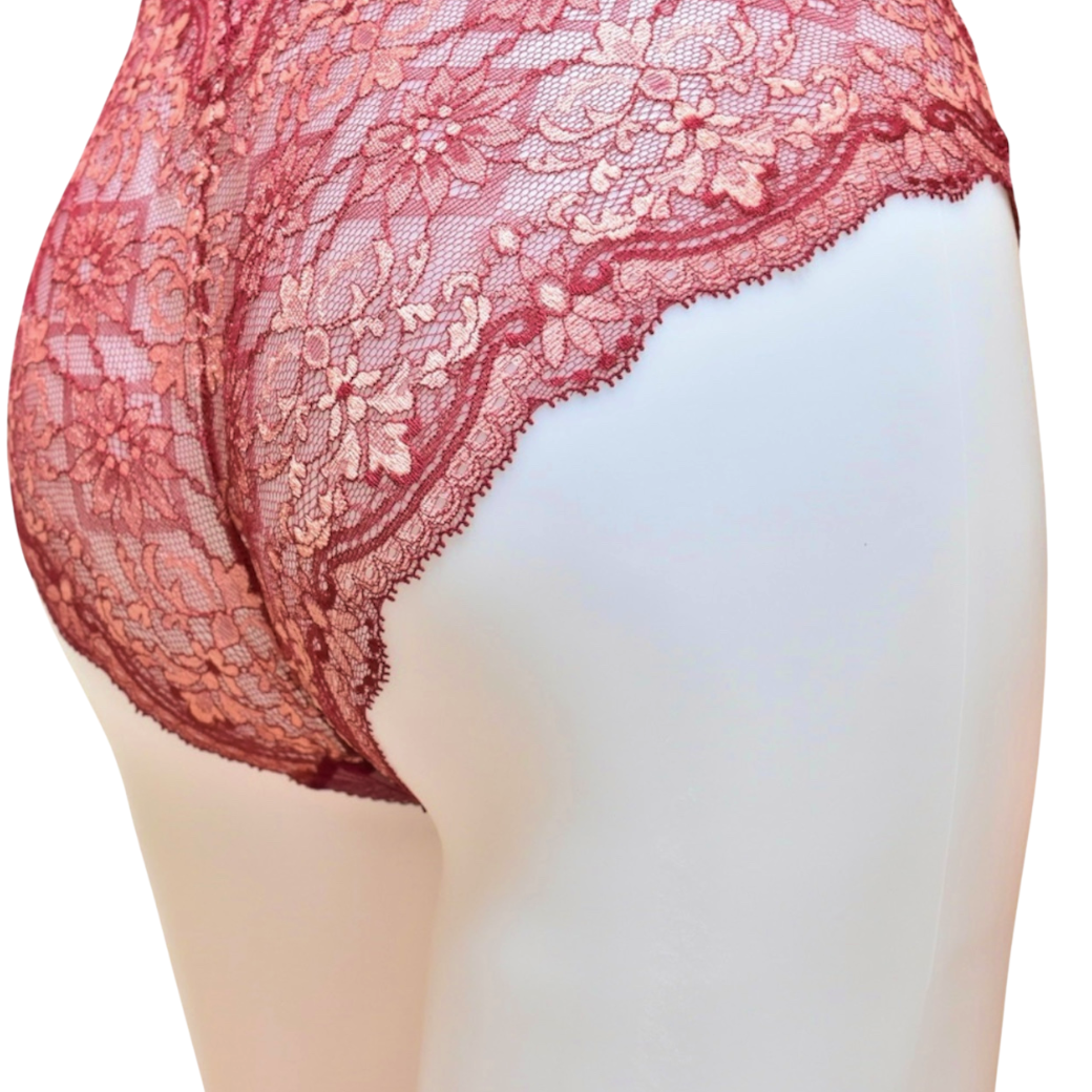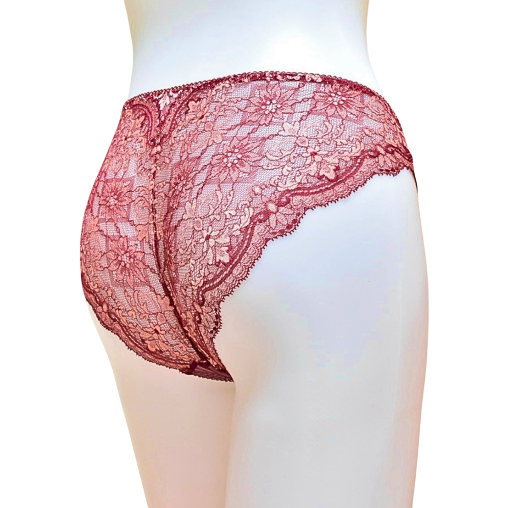 レース、土台の色はワインレッドピンク。ストラップと内側のゴムは深い臙脂(えんじ)色です。